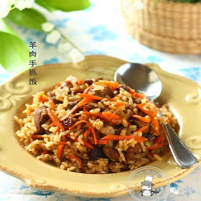 3.羊肉手抓饭 一、材料 香米、羊排、洋葱、胡萝卜、葡萄干、干辣椒碎、孜然粉+孜然颗粒(少量)、姜、料酒、老抽、生抽、蚝油。 二、步骤 1:洋葱、胡萝卜切丝、姜切末,葡萄干洗净; 2:羊排剁成小块,放入加了适量料酒的温水里煮开后,汆烫3-5分钟,捞出洗净备用; 3:锅里加入少量橄榄油烧热,放入羊排块翻炒,然后加入适量老抽上色、生抽、蚝油、调味; 4:倒入洋葱丝、胡萝卜丝、干辣椒碎、孜然粉、孜然颗粒,继续翻炒出香味; 5:加入适量洗净的香米,加入1倍半香米的温水、加入葡萄干; 6:将所有材料混合均匀后,转入电饭煲,按煮饭键煮熟即可。