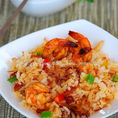 28.虾油炒饭 一、材料 鲜虾、香菇、玉米、冷米饭、葱姜、虾油、盐、料酒、胡椒粉、鸡精。 二、步骤 1 鲜虾洗净后剥去壳,跳去肠线,虾头留下备用; 2 冷锅放油,放入虾头和葱段,开火一边小火慢慢熬,一边用锅铲压压虾头,滗出虾膏; 3 熬至虾头酥脆,油色变红,盛起虾头滤油,撒上椒盐,熬好的虾油倒至容器中备用; 4 锅里放清水和姜丝,烧开后将虾仁放入,加点料酒汆熟捞出备用; 5 香菇用清水泡发后切丁备用; 6 炒锅烧热后放入虾油,烧热先后下香菇丁、玉米粒煸炒; 7 放入冷米饭炒热炒散,加盐、胡椒粉和鸡精炒匀; 8 加入虾仁和葱花炒匀即可。