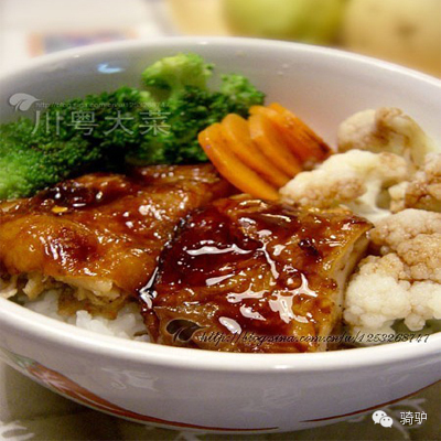12.烤鸡腿盖饭 一、材料 大鸡腿1只,青菜若干,我用了菜花、西兰花、胡萝卜。腌料:酱油2匙、蚝油2匙、盐半匙、蜂蜜2匙、辣椒粉半匙、五香粉半匙、鸡精适量、色拉油2匙、洋葱丝适量 二、步骤 1,鸡腿去骨 2,加腌料腌制2小时以上 3,烤箱预热200度,放烤箱中层用上火,鸡皮的一面朝下烤20分钟(烤的时候在烤盘下面放一小碟,里面装少许清水,这样烤出来的肉会很多汁),然后取出刷上腌料后,鸡皮面朝上再烤10分钟即可 4,在烤鸡腿时把菜花、西兰花拆小朵洗净,胡萝卜去皮洗净 5,锅中倒适量清水烧开,加1匙盐和1匙色拉油,将蔬菜焯熟待用 6,将烤好的鸡腿切成小块放在盛好的米饭上,配上适量蔬菜,淋上烧烤汁即可。