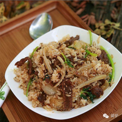 18.孜然牛肉炒饭 一、材料 牛肉(最好是牛里脊),米饭,香菜,洋葱,姜,孜然,芝麻,盐,糖,淀粉,料酒,酱油 二、步骤 1,把牛肉切成薄片,然后加入孜然,芝麻,少许的糖,料酒,酱油和姜丝抓匀,然后放入少量的淀粉抓匀备用。 2,把洋葱洗净切成丝,香菜洗净。 3,起锅倒油,油热后放入味好的牛肉翻炒一下放入洋葱,一起翻炒;等牛肉变色后放入米饭再加入一些孜然和芝麻炒匀,然后调入适量的盐,放入香菜翻炒均匀就做好了! PS:味牛肉的时候放入淀粉,是为了让牛肉保持软嫩的口感。孜然分两次放,第一次味肉的时候放是为了让牛肉更入味。第二次放是为了给米饭增香。