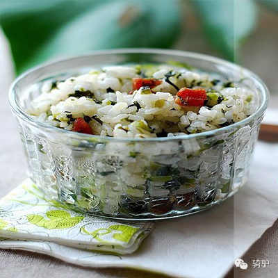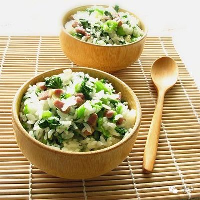 20.腊肉菜饭 一、材料 莴苣叶25克、腊肠1根、大米450克、盐3小匙、糖1/2小匙、色拉油少许 二、步骤 1、莴苣叶洗净,沥干水分后切碎,用少许盐腌制10分钟 2、腊肠切成碎粒待用,莴苣叶用手挤干水分 3、大米淘洗干净,加适量水(比平时煮饭的水稍微少一些) 4、热油锅下腊肠末与莴苣叶翻炒,调入少许盐和糖,煸软后起锅 5、电饭锅煮饭,当饭开始收水时倒入炒好的菜,拌匀 6、继续煮饭,直至跳起煮饭档即可。