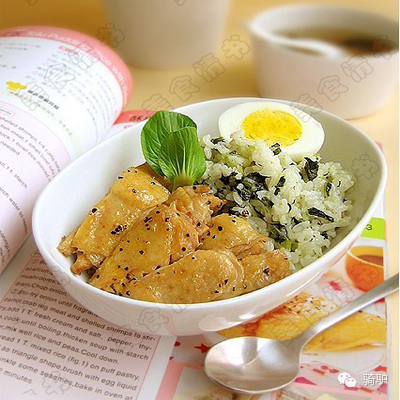5.鸡肉饭 一、材料 1只鸡腿350克(去骨) 熟米饭150克 西兰花5朵 白菜花5朵 胡萝卜片2 片葱5片 姜2片 调料:黑胡椒1/2茶匙(3克) 盐1/2茶匙(3克) 料酒1茶匙(5ml) 生抽2茶匙(10ml) 老抽1/2茶匙(3ml) 糖1/2茶匙(3克) 水淀粉1汤匙(15ml) 二、步骤 1) 鸡腿去骨洗净。将西兰花和白菜花,在淡盐水中浸泡5分钟后洗净,沥干水分。 2) 盘中放入鸡腿肉,放入黑胡椒,盐,料酒,葱,姜,拌匀后,腌制20分钟以上,有时间给肉做个“”的话,会更入味。 3) 趁着腌制鸡肉的时间,把西兰花,白菜花和胡萝卜片,焯烫半分钟,捞出后放入冷水中过凉,然后沥干备用。 4) 锅中倒入油,待油温5成热时放入葱片,小火煸出香味后,转大火,将腌好的鸡腿肉带鸡皮的那面朝下煎,1分钟后翻面,另一面同样也煎1分钟。 5) 鸡腿两面都煎好后,倒入水,水量没过鸡腿。锅中加入生抽,老抽,糖,调匀后煮开,盖上锅盖,用中火烧10分钟左右(烧得时候,肉朝下,皮朝上)。 6) 将炖煮好的鸡腿肉拿出。锅中的汤烧开后,淋入水淀粉勾芡成酱汁。 7) 把米饭盛入碗中,鸡腿肉切成条,和西兰花,白菜花,胡萝卜一起放在米饭上,淋入酱汁即可。