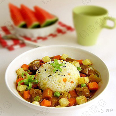 4.咖喱牛肉饭 一、材料 牛肉1斤、土豆1个、胡萝卜2根、元葱1个、黄油20克、牛奶500克、咖喱膏50克、蒜几瓣、姜几片、盐1勺、水1杯。 二、步骤 1、牛肉和蔬菜切成块。 2、黄油炒香蒜末,加入牛肉炒变色。 3、加入洋葱略炒。 4、加入胡萝卜翻炒。 5、加入土豆,加入咖喱膏、牛奶、水位刚刚没过食材就可以,最后加盐,熬煮到汤浓软烂就可以。