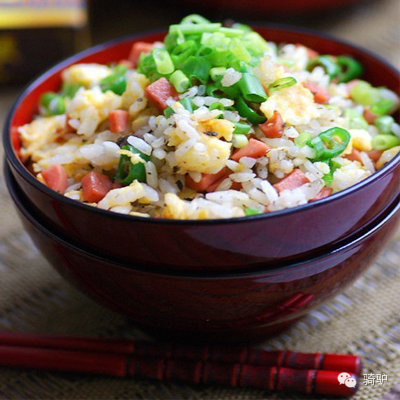 36.扬州炒饭 一、材料 隔夜饭一碗,鸡蛋一个,猪油10G,红肠半根,冬菜碎10G,青椒二根,葱花适量,盐2G 二、步骤 1、鸡蛋在碗内打散,红肠切粒,青椒洗净后切粒。 2、锅热后,放入猪油让它慢慢融化,融化后倒入隔夜饭,边炒的同时,用铲子压一压起坨的米饭,这个过程可能要花2分钟左右,但一定要细心把饭炒散开 3、饭炒散开以后,倒入蛋液,炒匀,这样炒出来的鸡蛋呈小颗粒状。 4、鸡蛋炒呈形后,倒入其他所有材料,炒散,最后调入盐炒匀即可起锅!